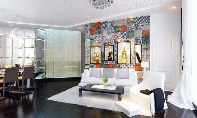 Phòng khách với tông trắng và nâu gỗ kết hợp. Chất liệu đá kết hợp với gỗ tôn lên vẻ sang trọng, hiện đại cho căn phòng, đồng thời đem đến cảm giác bề thế, lịch lãm cho gia chủ khi tiếp khách tại không gian này.
