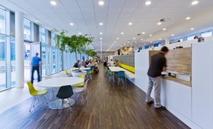 Bố trí nơi ăn uống, thư giãn ngay trong khu làm việc giúp nhân viên giữ gìn sức khỏe, không tốn thời gian đi lại. Văn phòng của tỉnh Friesland (Hà Lan) dành khoảng không rộng, thoáng đãng với cây xanh để nhân viên ăn ...